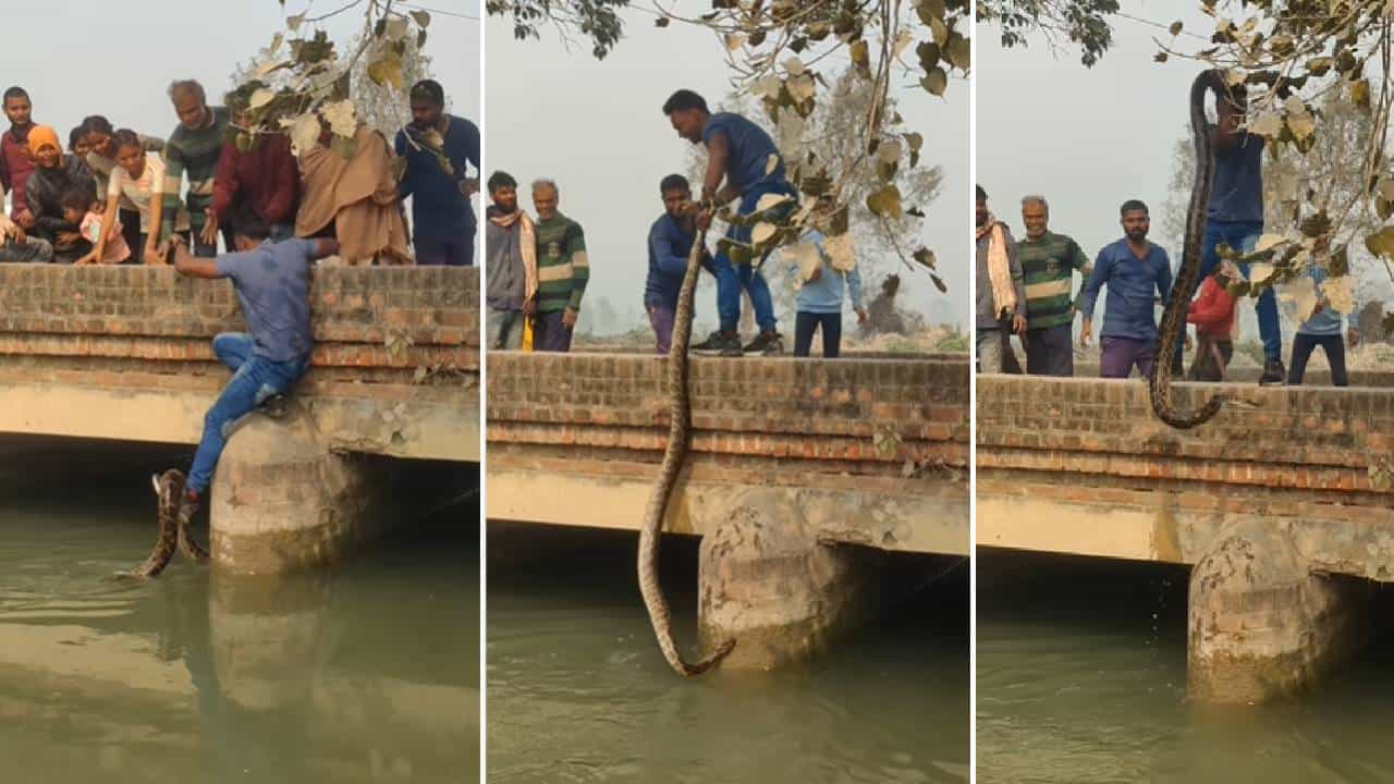 व्हायरल व्हिडीओनुसार, सर्वात प्रथम तरुणाने एका आकड्याच्या सहाय्याने अजगराला पाण्यातून वर उचललं. त्यानंतर त्याला पायात पकडलं आणि हाताने धरण्याचा प्रयत्न केला. पण हातातून अजगर निसटत असताना शेवटी शेपटी हातात आली. पण त्या तरुणाने कसलीही तमा न बाळगता. शेपटी गच्च पकडली आणि वर खेचलं. यावेळी अजगराने त्याच्यावर हल्ला करण्याचा देखील प्रयत्न केला. पण त्या तरुणाने स्वत:ला सांभाळून त्या अजगराला पुलावर खेचून आणलं. त्याच्या या कृतीचं सोशल मीडियावर कौतुक होत आहे.