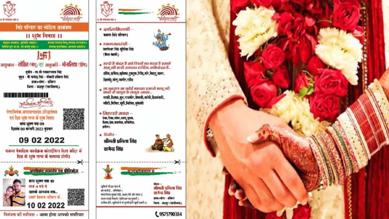 Wedding invitation card : लग्नसराईत महत्त्वाची गोष्ट म्हणजे निमंत्रण पत्रिका(Invitation card). छत्तीसगड(Chattisgarh)मधील जशपूर येथील रहिवासी असलेल्याने आधार कार्ड(Adhar Card)च्या धर्तीवर लग्नपत्रिका छापली आहे.