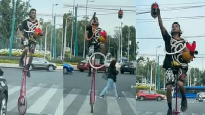 लोक रस्त्यावर ये-जा करत असल्याचं दिसून येत आहेत. तो माणूस प्रथम चाकांच्या सायकलवर बसतो आणि मग त्याच्या हातावर बॉल आणि प्लास्टिकच्या रिंग्स हलवू लागतो.