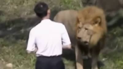 माणसू सिंहाशी शांतपणे बोलतोय, पुढे सिंह रागारागाने त्या माणसाच्या हातावर पंजा मारतो. एवढेच नव्हे तर सिंह गर्जना करू लागतो.