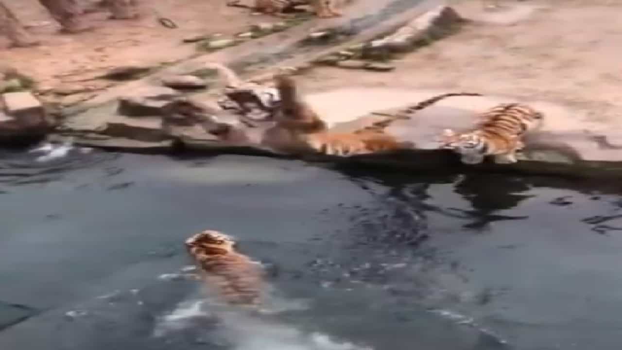 सध्या व्हायरल होत असलेल्या व्हिडीओ काही वाघ दिसत आहेत. हे वाघ जिथे उभे आहेत त्या परिसरात पाणी दिसते आहे. तसेच सर्व वाघांच्या समोर हवेत मांसाचा एक तुकडासुद्धा लटकतो आहे. समोर लुसलुशीत मांस दिसत असल्यामुळे सर्व वाघांची भूक चाळवली गेली आहे. हे सर्व वाघ लटकलेले मास फस्त करण्याचा प्रयत्न करत आहेत. त्यासाठी ते थेट हवेत झेप घेताना दिसतायत.