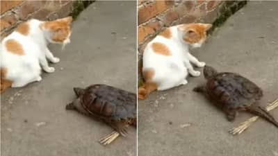 व्हायरल होत असलेल्या व्हिडीओमध्ये तांबड्या-पांढऱ्या रंगाच्या मांजरीवर कासवाने हल्ला केलाय. समोर दिसणारे कासव आपल्याला काहीही उपद्रव करणार नाही, असे मांजरीला वाटले असावे. कदाचित याच कारणामुळे मांजर शांतपणे उभी आहे. मात्र थोड्या वेळानंतर मांजरीवर कासवाने हल्ला केला आहे. हा हल्ला होताच मांजरीने पळ काढलाय. हा सर्व घटनाक्रम कॅमेऱ्यात कैद करण्यात आला आहे.