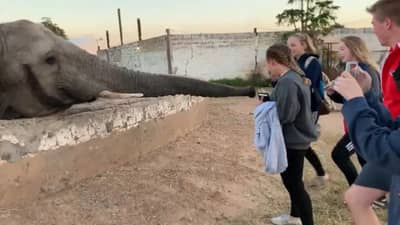 संबंधित व्हिडीओत पाच लोक दिसत आहेत. त्यापैकी दोन मुली हत्तीच्या सोंडेला हात लावत आहेत. त्याचवेळी तरुण एका बाजूने शुटींग करीत आहे. त्यानंतर हत्तीचं लक्ष मोबाईलमध्ये शुटींग करणाऱ्या तरुणीकडं जात. हत्ती सोंड मागे घेतो आणि जोरात मुली तोंडावर आणि मोबाईलवरती मारतो. त्यावेळी त्या मुलीचा मोबाईल तिच्या हातातून खाली पडतो.