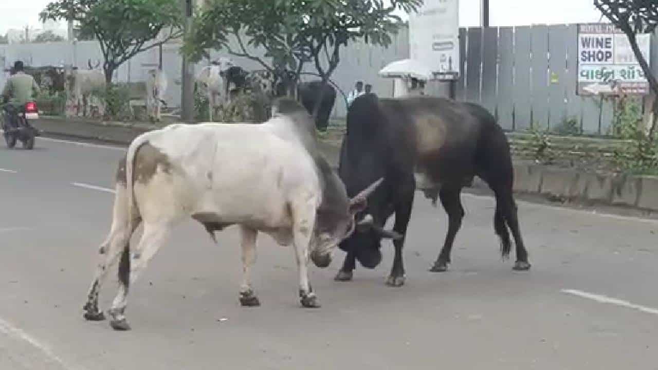 व्हिडिओत एक पांढऱ्या रंगाचा वळू आणि एक काळ्या रंगाचा वळू दिसून येतोय. हे एकमेकांच्या शिंगाला शिंगं लावून उभे आहेत. येणारे जाणारे प्रवासी त्यांच्याकडे बघतायत पण जवळ जायची हिंमत काय कुणी करत नाही. अर्धा तास ही कुस्ती चालू असते. भांडता भांडता ते फूटपाथच्या डिव्हायडर वर जाताना दिसून येतायत. तिथेच महामार्गावर या दोन वळू व्यतिरिक्त अजूनही मोकाट प्राणी पाहायला मिळतायत. इथल्या नागरिकांना हा रोजचा त्रास आहे.