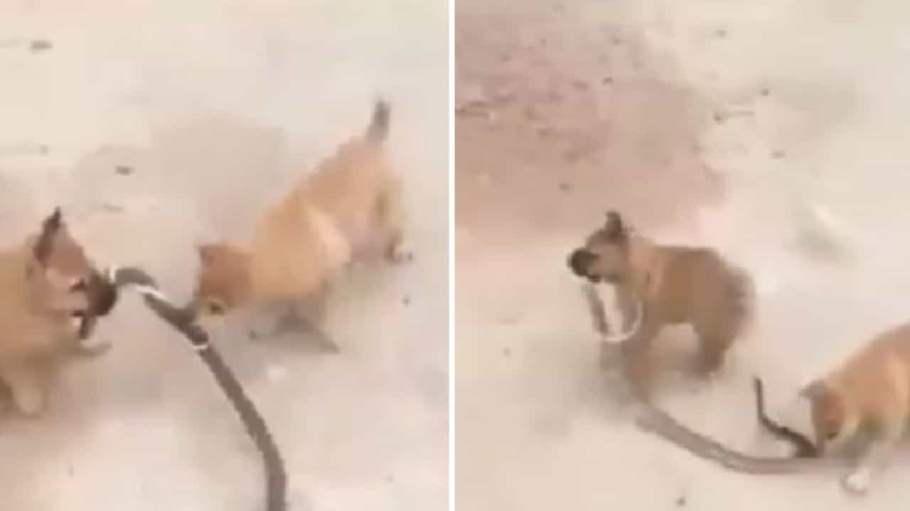 (Two Puppies playing together with snake video went viral on social media)