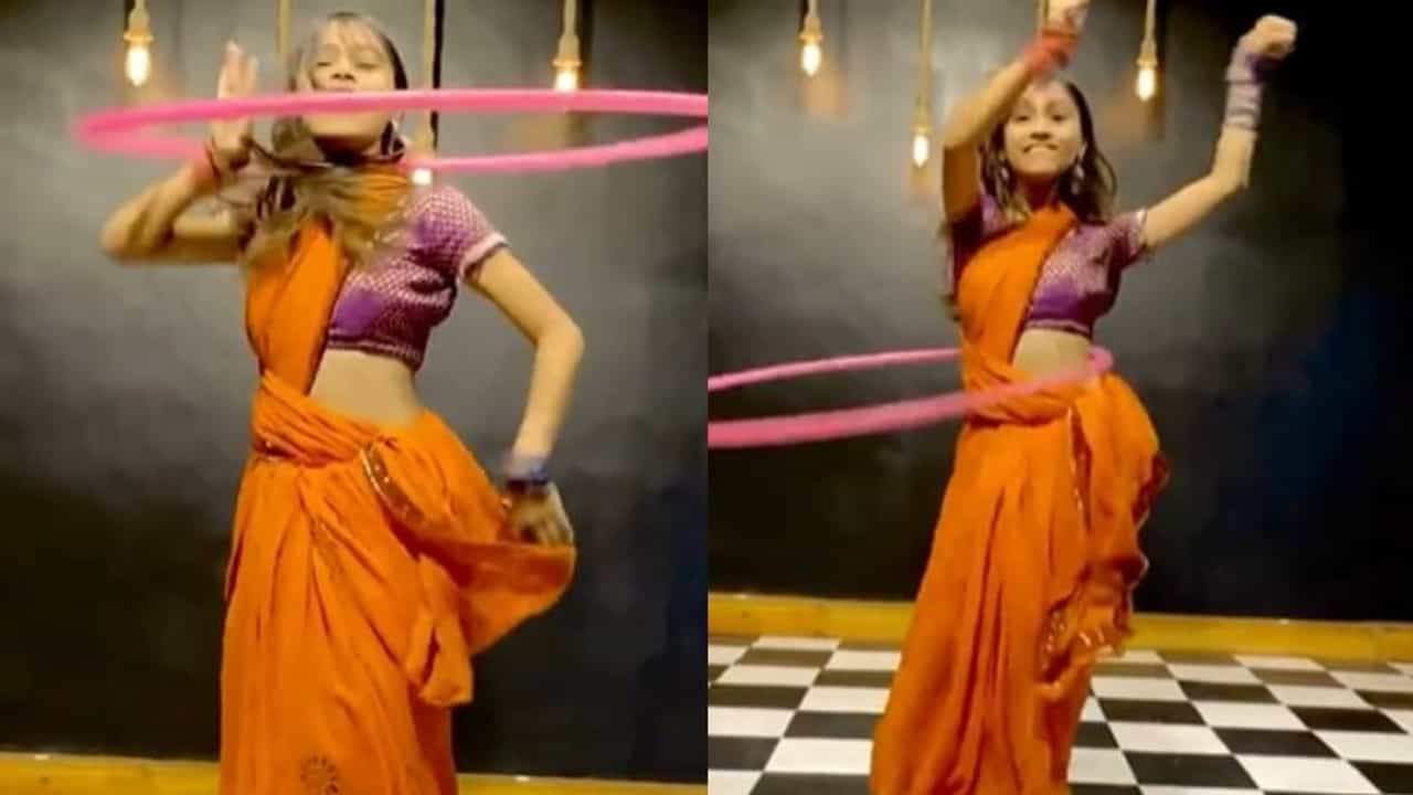 सध्या दिसणाऱ्या व्हिडीओमध्ये एका तरुणीने सुंदर साडी नेसली आहे. केशरी रंगाच्या साडीमध्ये ही तरुणी रिंग डान्स करते आहे. ही तरुणी माधुरी दीक्षित आणि मनिषा कोईराला या प्रख्यात नट्या थिरकलेल्या ‘बडी मुश्किल बाबा बडी मुश्किल’ या गाण्यावर डान्स करत आहे. बरं ही तरुणी फक्त डान्सच करते आहे असे नाही; तर डान्सोबत ती रिंगसुद्धा खेळते आहे. सांगायचं झालं तर ही तरुणी रिंग डान्स करते आहे.