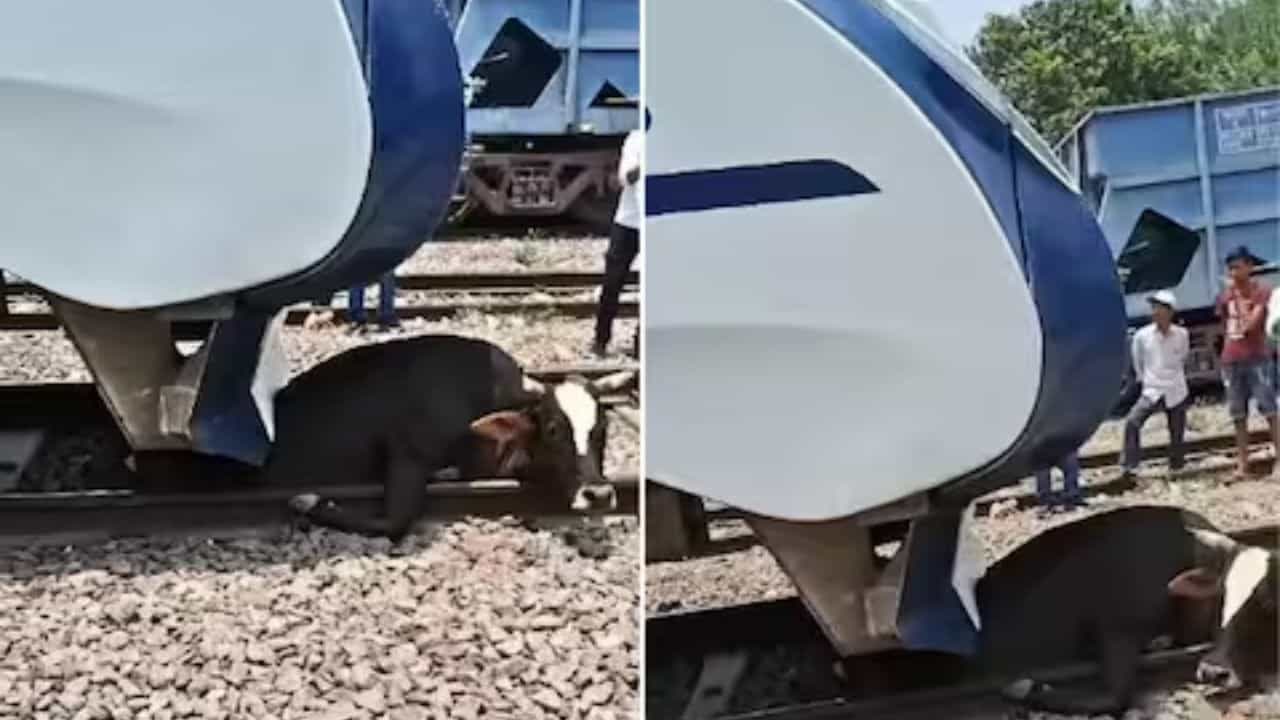 व्हायरल व्हिडिओत ट्रेनच्या खाली फसलेली गाय दिसत आहे. शेजारी एक मालगाडी उभी असल्याचे दिसत आहे. अनेक जण या घटनेचा व्हिडिओ बनवताना दिसत आहेत. वंदे भारत एक्स्प्रेस थोडी पुढे गेली असती तर गाईच्या धडकेमुळे मृत्यू झाला असता. तसेच ट्रेनचेही नुकसान झाले असते. परंतु ट्रॅकवर समोर गाय दिसताच लोको पायलटने त्वरीत गाडी थांबवली. त्यामुळे अपघात टळला.