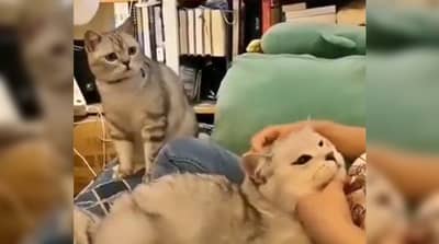 हा व्हिडिओ दोन मांजरींचा आहे, ज्यामध्ये त्यांचा केअरटेकर एका मांजरीला खूप प्रेमानं गोंजारतोय. ती देखील त्याचा आनंद घेतेय. त्याचवेळी दुसरी मांजर त्यांच्याकडे पाहतेय. यावेळी तिला खूप राग आलाय, आश्चर्य वाटतंय, असे तिचे हावभाव आपल्याला दिसून येतायत. सहसा असं आपण लहान मुलांमध्ये पाहतो. जेव्हा एका मुलाला त्याची आई कुरवाळत असते, त्यावेळी दुसऱ्याला राग येतो, तो चिडतो. असाच काहीसा प्रकार इथं झालाय. ही मांजरही चिडलीय.
