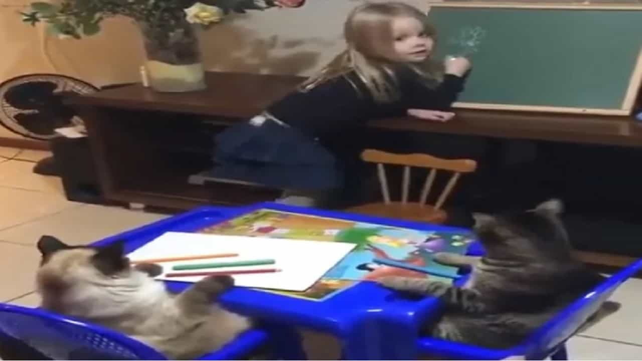 सध्या सोशल मीडियावर एक व्हिडीओ प्रचंड व्हायरल होताना दिसत आहे. त्या व्हिडीओमध्ये एक लहान मुलगी (Little girl) आहे आणि ती चक्क दोन मांजरींना (Cat) शिकवताना दिसत आहे. विशेष म्हणजे या दोन्ही मांजरी ती लहान मुलगी काय शिकवत आहे, याकडे बारकाईने लक्ष देत आहे. आपण व्हिडीओमध्ये पाहू शकतो की, या दोन्ही मांजरी खूर्चीवर बसल्या आहेत आणि ती लहान मुलगी बोर्डवर काही तरी लिहिते आहे आणि मांजरींना शिकवते आहे.