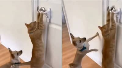 व्हिडिओमध्ये दिसत आहे की, मांजर बराच वेळ दरवाजा उघडण्याचा प्रयत्न करते, पण यश मिळत नाही. यानंतर ती दरवाजाच्या कुलूपावर उडी मारून चढते. मांजर दरवाजाच्या कुलूपावर उडी मारताच ती उघडण्यात यशस्वी होते. त्यामुळे दोघेही चोरासारखे दार उघडून आतमध्ये प्रवेश करतात. हा व्हायरल व्हिडिओ इन्स्टाग्राम या सोशल मीडिया प्लॅटफॉर्मवर शेअर करण्यात आला आहे. पेजवरील सर्व व्हिडिओ तुम्ही_more_pawsitive पाहू शकता. या व्हिडिओला आतापर्यंत हजारो लाईक्स आणि कमेंट्स पाहायला मिळत आहेत. लोकांच्या प्रतिक्रियांबद्दल बोलताना एका यूजरने लिहिले – तिथे या दोघांची जोडी अप्रतिम आहे. आणखी एका यूजरने लिहिले – कुत्रा आणि मांजरीचा हा व्हिडिओ खूपच मजेदार आहे. व्हिडिओच्या कमेंट सेक्शनमध्ये हजारो इमोजीही पाहायला मिळत आहेत.