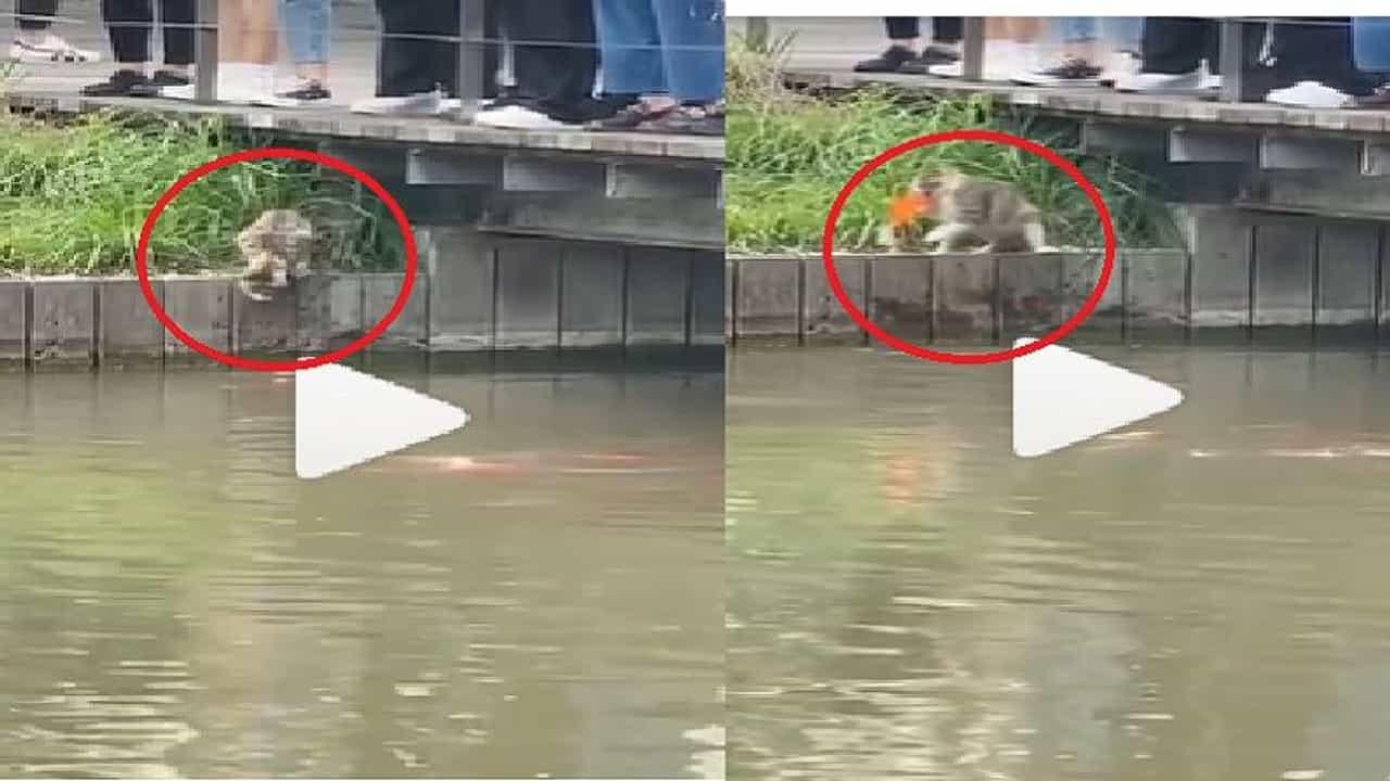 (video of Cat who caught Fish from river goes viral on social media)