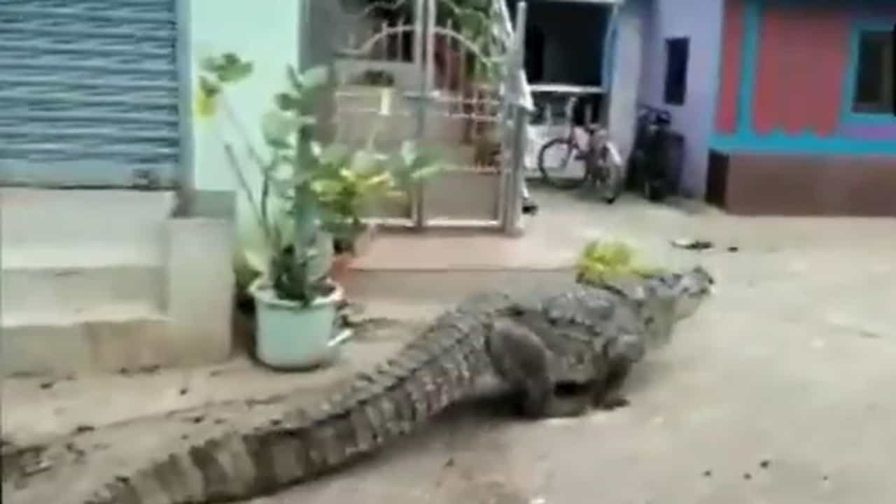 सध्या असाच एक चकित करणारा व्हिडीओ समाजमाध्यमांवर व्हायरल होतो आहे. या व्हिडीओमध्ये एक मगर थेट मानवी वस्तीमध्ये घुसली असून ती रस्त्यावर फिरते आहे.
