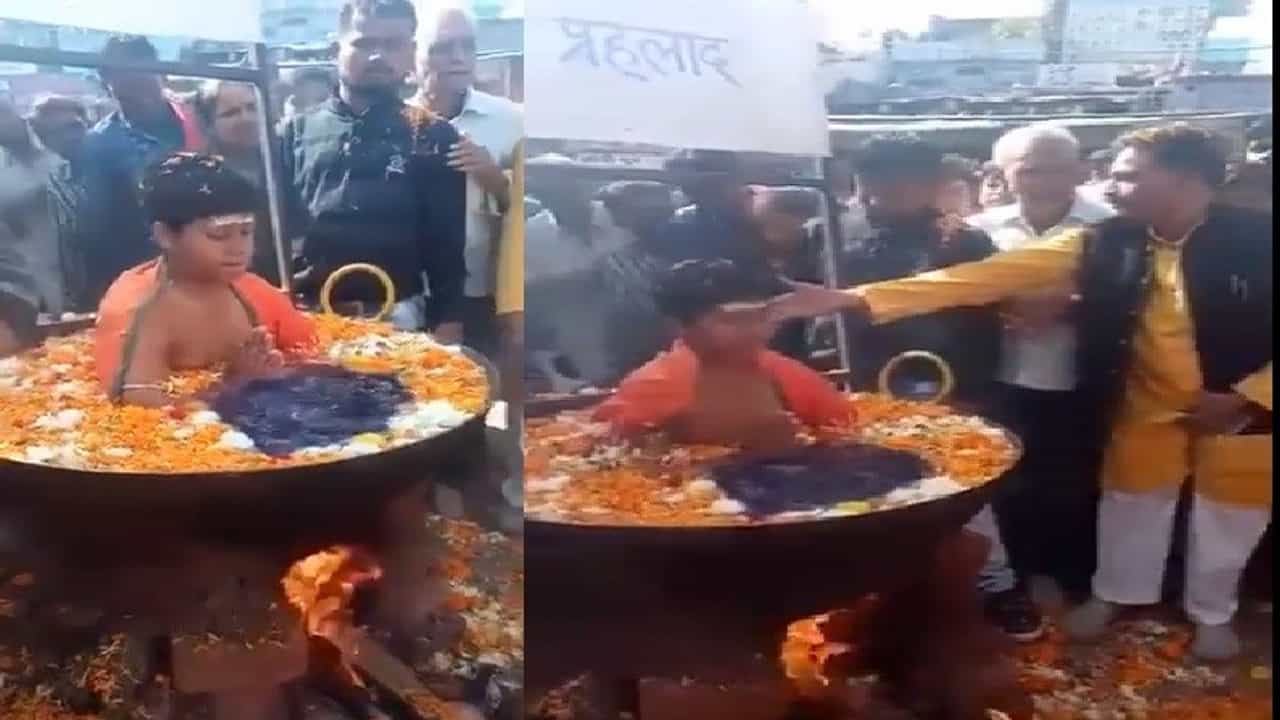 भांड्यातील पाणी उकळत असूनही उष्णतेचा मुलावर कोणताही परिणाम होताना दिसत नाही. मुलगा ध्यानस्थ अवस्थेत हात जोडून काहीसे मंत्र पुटपुटताना या व्हिडीओमध्ये दिसत आहे.
