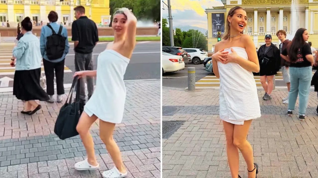 रस्त्यावर टॉवेल गुंडाळून डान्स केलेल्या अभिनेत्री काजोलला तुम्ही पाहीलेच असेल परंतू एक रशियन तरुणी चक्क रिअल लाईफमध्ये अशी टॉवेल गुंडाळुन रस्त्यावर पाहून अनेकांना धक्का बसला, तिला पाहून काही महिला तर डोकं फिरलंय का असे हाताने इशारे करीत खुणवत आहेत.