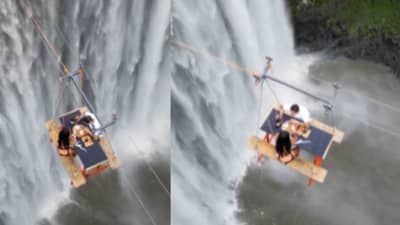 हा व्हिडीओ बघा, या व्हिडीओ मध्ये एक आधी धबधबा दिसेल. हा धबधबा बघून तुम्हाला खूप छान वाटेल. निसर्गाचं इतकं सुंदर दृश्य इथे या व्हिडिओमध्ये की बास्स. काही सेकंदाने तुम्हाला या व्हिडीओमध्ये एक जोडपं उंच आकाशात बसलेलं दिसेल. हा व्हिडीओ इतका सुंदर आहे की कुणालाही इथे डेट करायची इच्छा होईल. यात एक मुलगा मुलगी छान पणे आकाशात २९५ फूट उंचीवर बसलेले आहेत. इथे एक जेवणाचा टेबल दोऱ्यांवर आहे. वर हा टेबल लटकतोय आणि यावर बसून हे जोडपं जेवणाचा आनंद घेतोय.