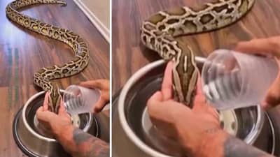 व्हायरल होत असलेल्या व्हिडिओमध्ये तुम्ही पाहू शकता, की घरातल्या एका व्यक्तीनं एका प्लेटच्या वर एक भांडं ठेवलं आहे. हे पाण्यानं भरलेलं आहे. तर त्याच्या हातात एक मोठा साप दिसतोय. ही व्यक्ती आपल्या ओंजळीनं या सापाला पाणी देताना दिसत आहे. हा व्हिडिओ पाहून काहींना आश्चर्याचा धक्का बसला आहे, तर काहींनी तो पाहिल्यानंतर त्या व्यक्तीला वेडा म्हटलंय. साप किती भयंकर दिसतोय हे तुम्ही व्हिडिओमध्ये पाहू शकता. मात्र पाणी पिणारा साप व्यक्तीवर हल्ला करत नाही.