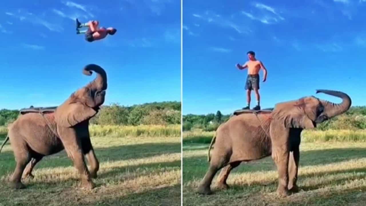 Viral : ‘हे’ अप्रतिमच आहे! बॅकफ्लिप्स मारून हत्तीच्या अंगावर जाणं सोपं नाही, पाहा Stunt video