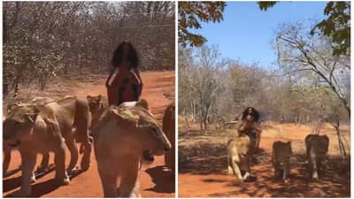 एक व्हिडिओ (Video) सध्या व्हायरल (Viral) होतोय. यात एक महिला सिंहिणीं(Lionesses)सोबत जाताना दिसतेय. सहा सिंहिणींसोबत जंगलात फिरतानाचा हा व्हिडिओ आहे. ते तिचे पाळीव प्राणी असल्यासारखे भासत आहे. या व्हिडिओमध्ये सिंहिणींसोबत मागे फिरणारी महिला कॅमेऱ्यात कैद झालीय. शेवटच्या फ्रेममध्ये एका सिंहिणीची शेपटी धरून चालत असताना ती महिला दिसतेय.