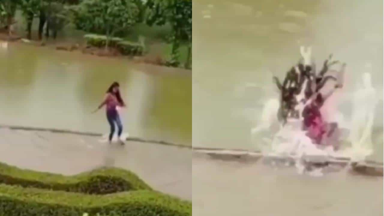 ही मुलगी बघा, छान व्हिडीओ काढायचा म्हणून हा सगळा अट्टाहास! व्हिडीओ नीट बघा, ती आधी छान उड्या मारतीये. तिला वाटत आपल्याला पाणी आत्ता जितकं खोल वाटतंय तितकंच खोल सगळ्या भागात असेल.
