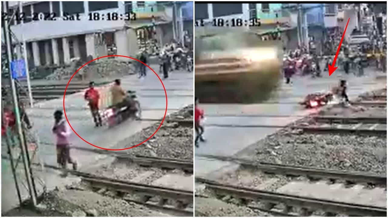 Video : काळ आला होता, पण.., काही मिनिटं वाचवणं रेल्वे रूळ ओलांडणाऱ्या दुचाकीस्वाराला पडलं महागात