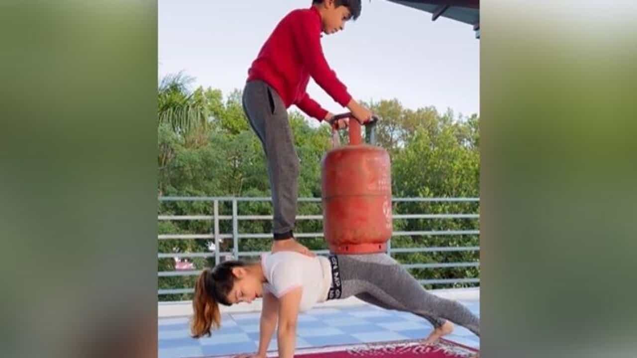(young women doing exercise by keeping gas cylinder and boy on her back video went viral on social media)