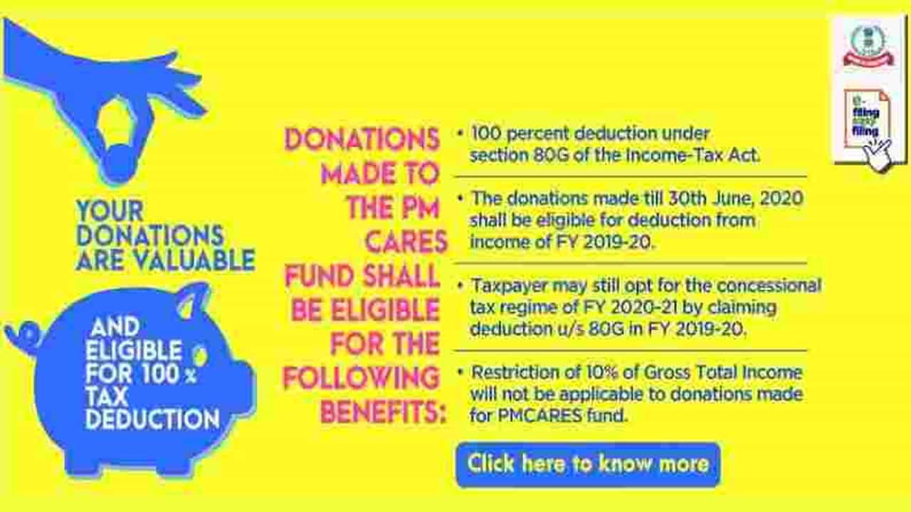 आयकरात असे म्हटले आहे की, पीएम केअर फंडाला 30 जून 2020 पर्यंत दिलेली देणगीची रक्कम 2019-20 या आर्थिक वर्षासाठी कर कपातीच्या कक्षेत येईल. सन 2019-20 मध्ये सन 2020-21 या आर्थिक वर्षात कन्सेशनल कर प्रणालीत 80 जी अंतर्गत डिडक्शनचा लाभ मिळवू शकता. जर एखादी व्यक्ती पीएम केअर फंडासाठी देणगी देत असेल तर एकूण उत्पन्नाच्या 10 टक्के हिस्सा देणगी देण्यात सक्ती राहणार नाही.