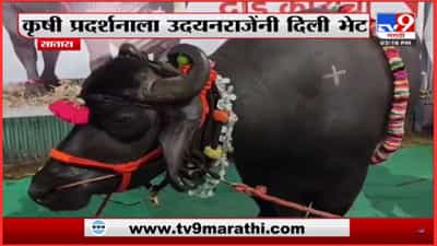 सातारा | 19 ऑक्टोंबर 2023 : सातारा येथील जिल्हा परिषद मैदानावर कृषी प्रदर्शन भरविण्यात आले आहे. या प्रदर्शनात शेतकऱ्यांना शेतीविषयक लागणारी विविध अवजारे, उच्च जातीचे गुरे, विविध जातीचे बियाणे ठेवण्यात आली आहेत. साताऱ्याचे खासदार उदयनराजे भोसले यांनी या कृषी प्रदर्शनास भेट दिली. त्यावेळी त्यांचे लक्ष एका रेड्याने वेधले. दीड कोटी रुपयांचा हा रेडा कृषी प्रदर्शनाला भेट देणाऱ्या सर्वाचे लक्ष वेधून घेत आहे. खासदार उदयनराजे भोसले यांनी हा रेडा पाहिला आणि ते देखील चकित झाले. दीड कोटीच्या रेड्यासोबत फोटोसेशन करण्याचा मोह खासदार उदयनराजे भोसले यांना आवरता आला नाही. त्यांनी त्या रेड्यासोबत स्वत: फोटो सेशन केलं. दीड कोटीचा हा रेडा पाहण्यासाठी लोकांची कृषी प्रदर्शनात एकच झुंबड उडालीय.