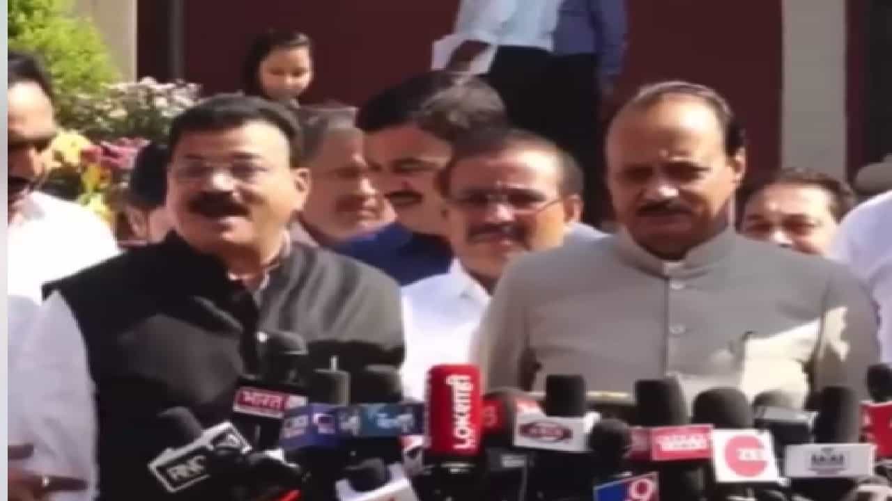 पत्रकार परिषदेत मध्यभागी अजित पवार, त्यांच्या बाजूला डाव्या बाजूने भास्कर जाधव आणि त्यानंतर जयंत पाटील दिसत आहेत. अजित पवारांचं बोलणं सुरु होण्याआधी जयंत पाटील भास्कर जाधवांना म्हणतात