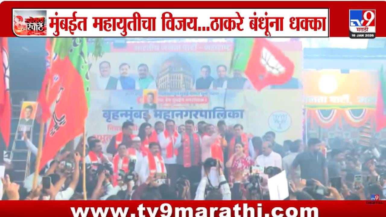 महायुतीने मुंबई महापालिकेवर कब्जा मिळवत मोठा राजकीय विजय संपादन केला आहे. भाजप आणि मुख्यमंत्री एकनाथ शिंदे यांच्या शिवसेनेच्या महायुतीने स्पष्ट बहुमत मिळवले असून ठाकरे बंधूंना हा मोठा धक्का मानला जात आहे. तब्बल 25 वर्षांनंतर ठाकरे गटाच्या हातातून मुंबई महानगरपालिका निसटली असून, मुंबई महापालिकेवर भाजपचा झेंडा फडकला आहे.