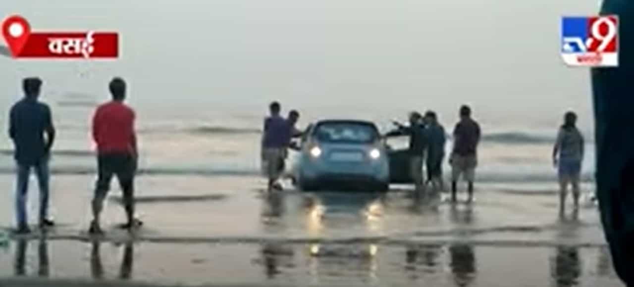 Marathi News Videos Car got stuck in water on rajodi shore managed to get out with the help of tourists vasai