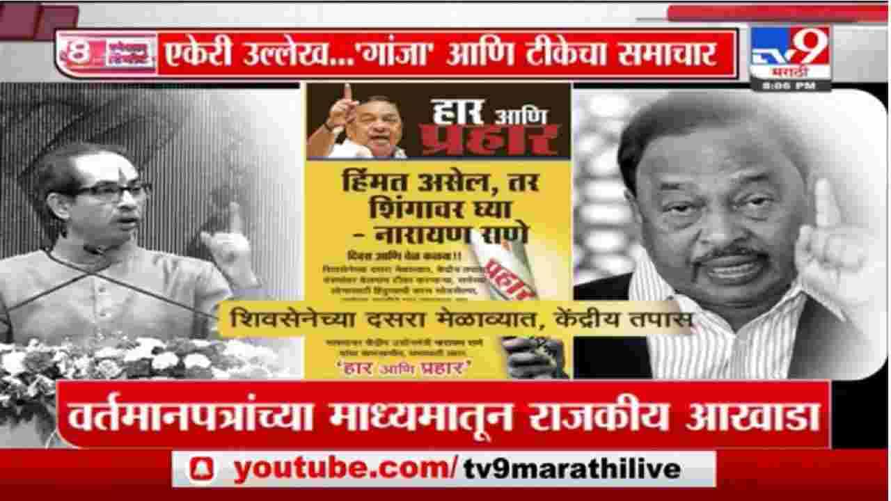 मुंबई : सध्या सामाविरुद्ध तरुण भारत आणि सामना विरुद्ध प्रहार अशी तिहेरी लढत सुरु झाली आहे. राणे प्रहारमधून गुरुवारी कसा प्रहार करतात हे पाहणे औत्सुक्याचे ठरेल. दसरा मेळाव्यात पंतप्रधान मोदी आणि भाजपवर उद्धव ठाकरेंची तोफ धडाडल्यानंतर आता राणे आक्रमक झालेत. उद्धव ठाकरेंना प्रत्युत्तर देण्यासाठी नारायण राणेंनीही कंबर कसलीये. त्याची झलक राणेंनी त्यांचे मुखपत्र प्रहार या वृत्तपत्रात बातमी स्वरुपात पोस्ट करुन दाखवली. हिंमत असेल तर शिंगावर घ्या असं आव्हानच राणेंनी उद्धव ठाकरेंना दिलंय. दुसरीकडे सामना विरुद्ध तरुण भारत अशी संपादकीय लढाई रंगली आहे. शरद पवारांचा एकेरी उल्लेख केल्यानंतर काही जण गांजा मारुन बोलतात अशी टीका राऊतांनी केली होती. संपादकीयतून कमी प्रतीचा गांजा अशी टीका केली आहे. याच टीकेला भाजपची बाजू घेणाऱ्या तरुण भारतमधून प्रत्युत्तर देण्यात आलं.