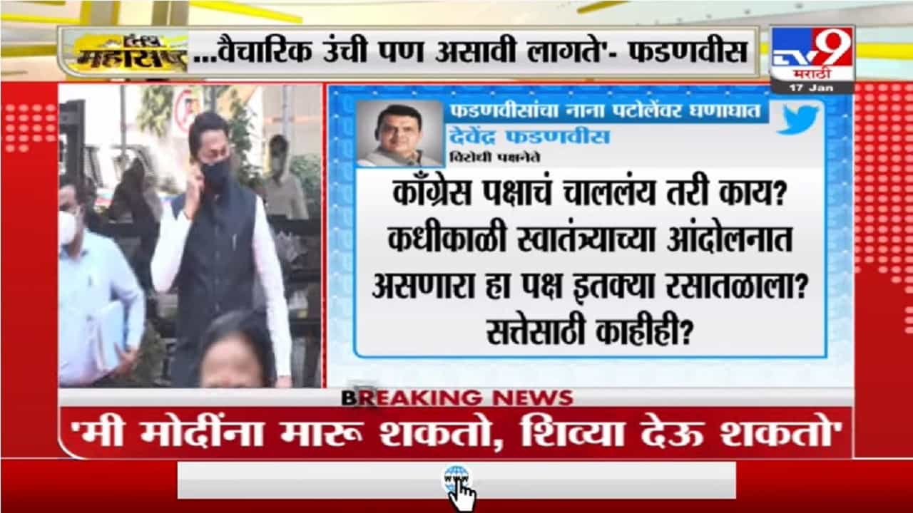 मुंबई : काँग्रेस प्रदेशाध्यक्ष नाना पटोले (Nana Patole) यांच्या एका वक्तव्यामुळे राज्यातील राजकारण आता पुन्हा एकदा तापण्याची शक्यता निर्माण झालीय. पटोले यांनी ‘मी मोदींना मारु शकतो आणि शिव्या देऊ शकतो’, असं वक्तव्य केलं आहे. त्याबाबतचा एक व्हिडीओ सध्या सोशल मीडियावर (Social Media) चांगलाच व्हायरल होतोय. दरम्यान, हा व्हिडीओ व्हायरल झाल्यानंतर पोटोले यांनी याबाबत सारवासारव करण्याचा प्रयत्न केलाय. ‘पाकिस्तानच्या सीमेनजीक पंजाबमध्ये मा. पंतप्रधान नरेंद्र मोदीजी यांचा ताफा 20 मिनिटे खोळंबून राहतो, तेथील काँग्रेसचे मुख्यमंत्री त्याची साधी दखल सुद्धा घेत नाहीत. आता महाराष्ट्राचे काँग्रेस अध्यक्ष म्हणतात, मी मोदींना मारु शकतो, शिव्या देऊ शकतो…काँग्रेस पक्षाचे चालले तरी काय? कधीकाळी स्वातंत्र्याच्या आंदोलनात असणारा हा पक्ष इतक्या रसातळाला? सत्तेसाठी काहीही ? काँग्रेसला आता लोकशाहीतील राजकीय पक्ष म्हणायचे, की दहशत पसरविणारे संघटन? नानाभाऊ केवळ शारीरिक उंची असून चालत नाही, वैचारिक-बौद्धिक उंची पण असावी लागते!’ असं ट्वीट करत फडणवीस यांनी पटोलेंवर जोरदार निशाणा साधला आहे.