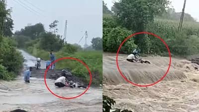पुराच्या पाण्यात अडकलेली मोटारसायकल जिवाच्या आकांताने वाचवण्याची धडपड केली मात्र ती वाहून गेली आणि यासोबत चालकही वाहून गेला. याच धक्कादायक घटनेचा व्हिडिओ मोबाईल कॅमेऱ्यात कैद झाला आहे. बघा सोशल मीडियावर व्हायरल होणारा हा धक्कादायक व्हिडीओ