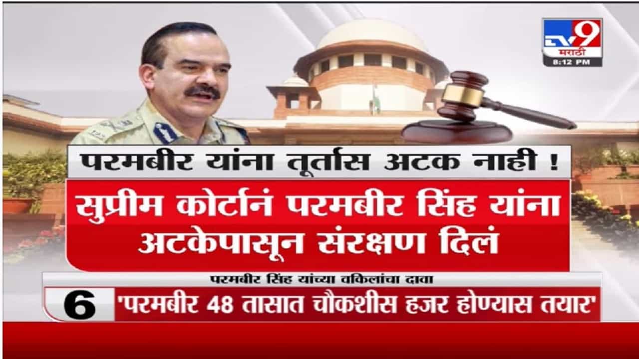 नवी दिल्ली : सुप्रीम कोर्टाकडून मुंबईचे माजी पोलीस आयुक्त परमबीर सिंह यांना अटकेपासून संरक्षण देण्यात आलं आहे. मुंबई पोलीस आणि सीबीआयनं परमबीर सिंह यांना 6 डिसेंबरपर्यंत अटक करु नये, असे आदेश दिले आहेत. सुप्रीम कोर्टात परमबीर सिंह यांचे वकील पुनीत बाली यांनी ते भारतात आहेत. या प्रकरणांचा तपास सीबीआयकडे दिल्यास ते 48 तासात समोर येतील, असं बाली म्हणाले. परमबीर सिंह यांच्या प्रकरणांचा तपास सीबीआयकडे द्यावा, अशी मागणी पुनीत बाली यांनी केली आहे. सीबीआयकडे या प्रकरणांचा तपास गेला तर ते कोणत्याही क्षणी समोर येतील, असं सिंह यांच्या वकिलांनी म्हटलं आहे.