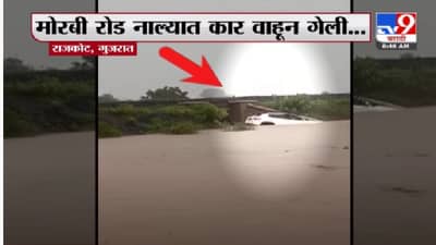 गेल्या काही दिवसांपासून ठिकठिकाणी अक्षरशः ढगफुटीसदृश्य पाऊस कोसळला. त्यामुळे अनेक भागात पावसामुळे भीषण परिस्थिती निर्माण झाली होती. गुजरात राज्यालाही पावसाचा जोरदार फटका बसला आहे. त्यामुळे जनजीवन पूर्णपणे विस्कळीत झालं आहे. अनेक ठिकाणी पाणी साचल्यामुळे वाहनंही नादुरुस्त झाली आहेत. गुजरातमधील राजकोटमध्ये अशीच भीषण स्थिती पाहायला मिळाली. पाणी साचल्यामुळे मोरबी रोड नाल्यात कार वाहून गेली. सुदैवाने कारमधील दोघा प्रवाशांना वाचवण्यात यश आलं आहे. ही दृश्यं कॅमेरात कैद झाली आहेत