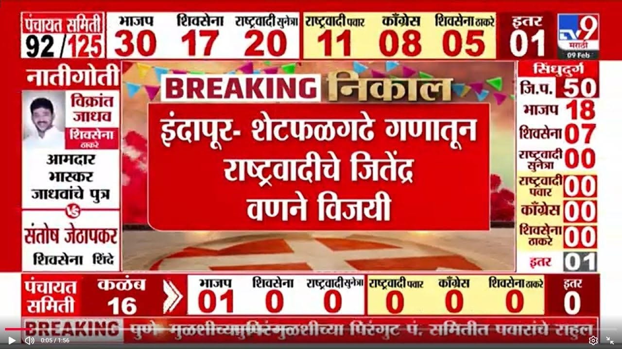 इंदापूर शेतफळगढे गणातून राष्ट्रवादी काँग्रेसचे जितेंद्र वणणे विजयी झाले आहेत. पंचायत समिती आणि जिल्हा परिषद निवडणुकांमध्ये भाजपने सर्वाधिक जागा जिंकत आपले वर्चस्व सिद्ध केले आहे. महायुतीने पंचायत समितीत आघाडी घेतली असून, दादांच्या राष्ट्रवादीने चांगले प्रदर्शन केले आहे. शरद पवारांची राष्ट्रवादी आणि ठाकरेंची शिवसेना मात्र पिछाडीवर राहिली आहे.