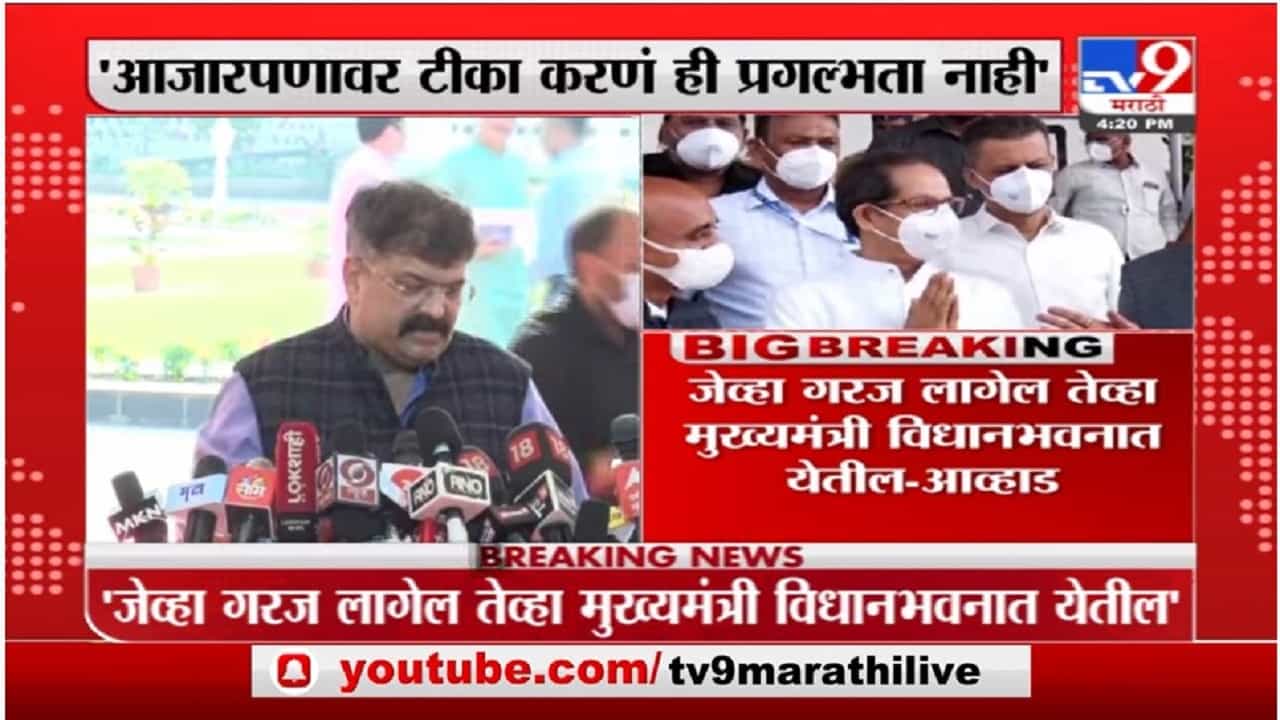 आपला बाप आजारी असताना आपण चर्चा करतो का? असा सवाल आव्हाडांनी केलाय. कुणाच्या तरी आजारपणावर टीका करणे ही प्रगल्भता नाही. जेव्हा गरज लागेल तेव्हा मुख्यमंत्री विधानभवनात येतील.