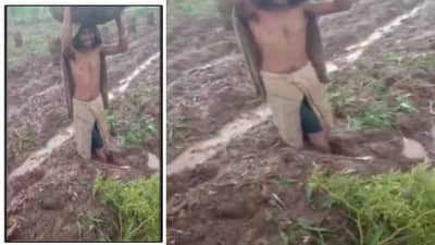 Satara Rain : पावसाचा कहर, शेतात चिखलच चिखल… शेतकऱ्याचे पाय मातीत रुतले, शेतमाल बाहेर काढताना कसरत