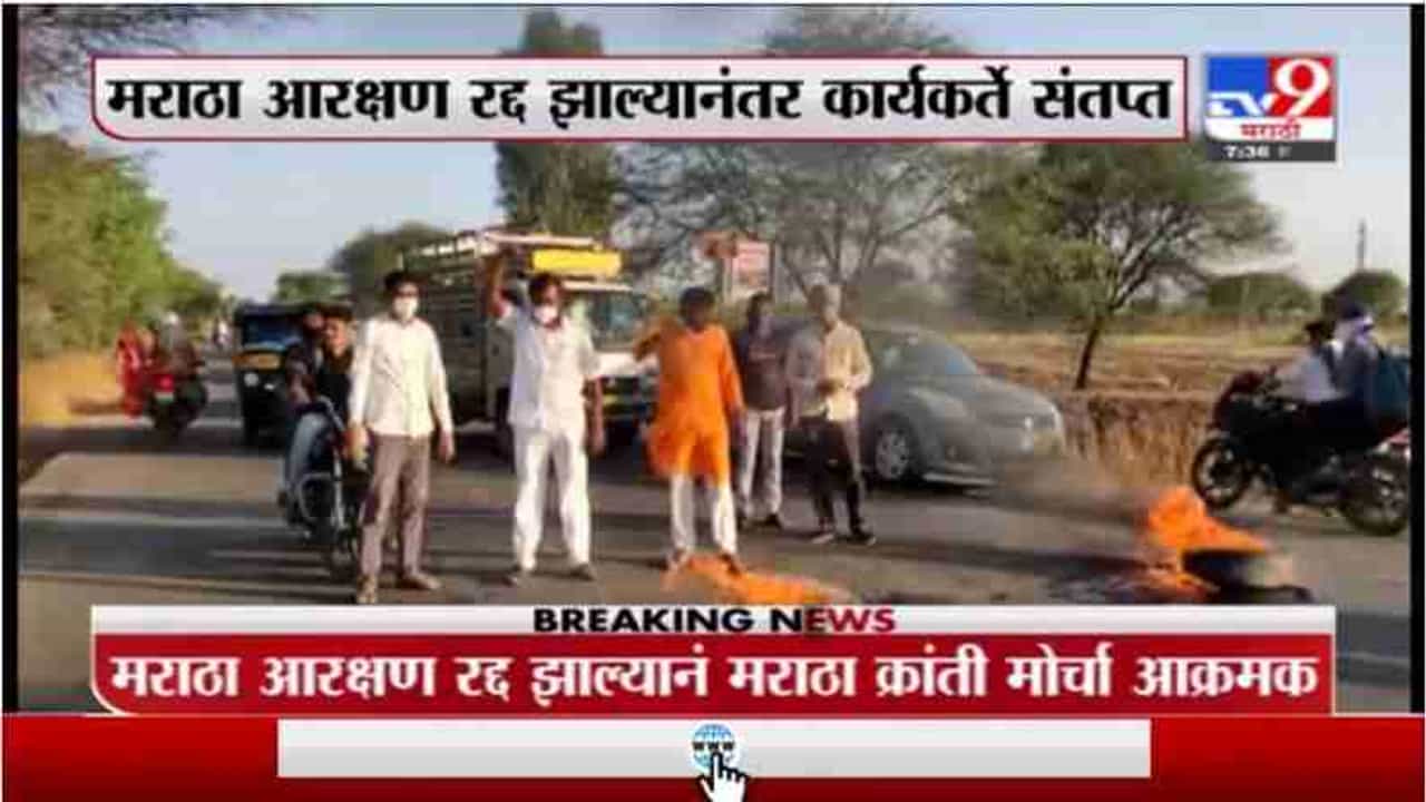रस्त्यावर टायर पेटवून देत रस्ता रोको केला. मराठा आरक्षण रद्द झाल्यानंतर सरकारविरोधात संताप व्यक्त करण्यात येत आहे. (Maratha Kranti Morcha aggressive in Aurangabad, burning of tires on Cambridge bypass)