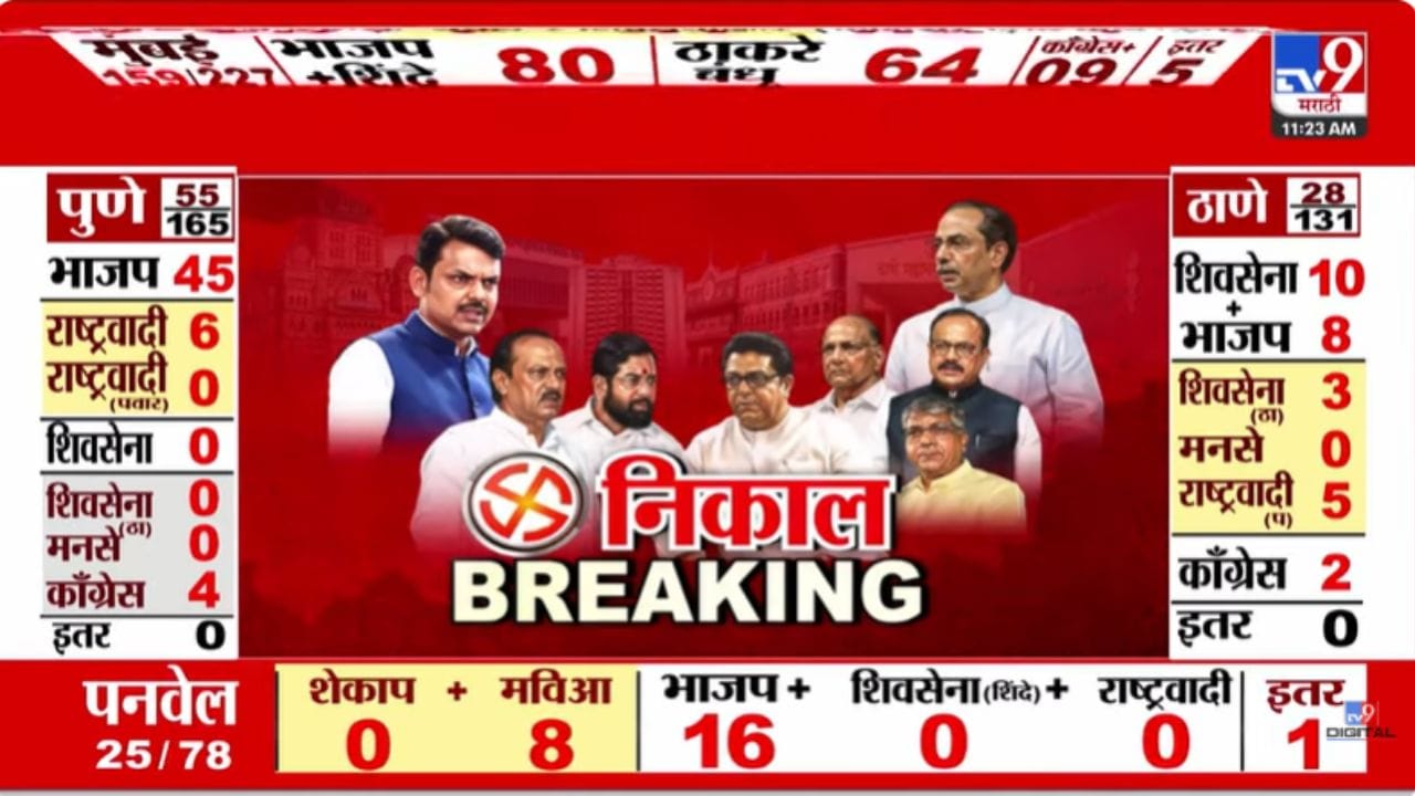 मुंबईत विविध प्रभागांमधून महत्त्वाचे कल प्राप्त झाले आहेत. प्रभाग ३७ मध्ये ठाकरेंच्या शिवसेनेच्या योगिता कदम आघाडीवर आहेत, तर प्रभाग ३६ मध्ये मनसेचे उमेदवार पुढे आहेत. प्रभाग ३३ मध्ये भाजपचे उज्वल वैती आणि प्रभाग १० मध्ये भाजपचे जितेंद्र पटेल आघाडीवर आहेत. मुंबई प्रभाग ८७ मध्ये भाजपचे कृष्णा पारकर आघाडीवर असल्याचे दिसून येते.