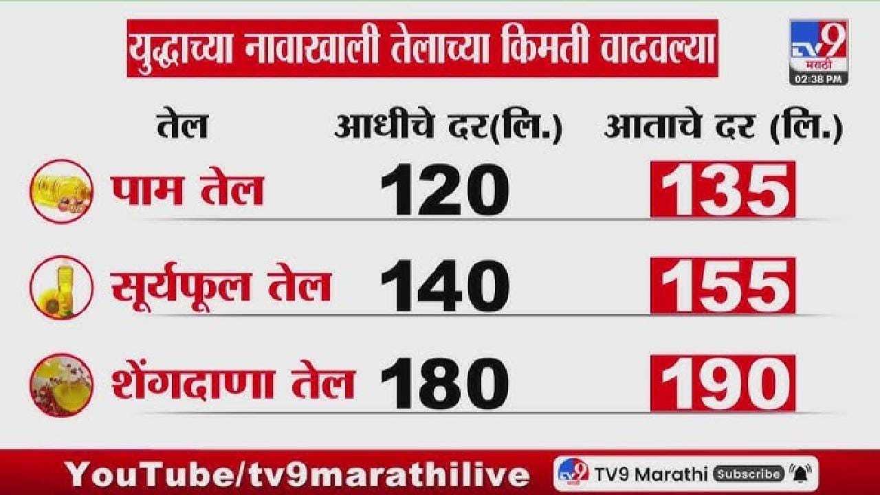 राज्यात गॅस तुटवड्यामुळे नागरिकांना सिलेंडर मिळण्यात अडचणी येत असतानाच आता जीवनावश्यक वस्तूंच्या दरातही वाढ झाल्याने सर्वसामान्यांना दुहेरी फटका बसत आहे. युद्धाच्या पार्श्वभूमीवर तेलाच्या किमतीत वाढ झाल्याचे व्यापाऱ्यांकडून सांगितले जात आहे. किरकोळ बाजारात सूर्यफूल तेलाच्या किमतीत सुमारे 13 रुपयांची वाढ झाली आहे.