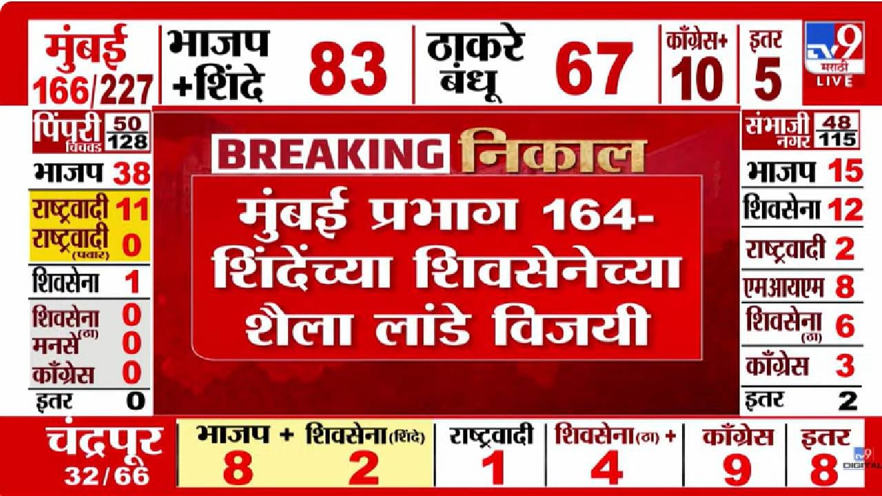 मुंबई महानगरपालिका निवडणुकीचे निकाल जाहीर होण्यास सुरुवात झाली आहे. मुंबईच्या प्रभाग क्र. 164 मधील शिंदेंच्या शिवसेनेच्या शैला लांडे विजयी झाल्या आहेत. 164 प्रभागातून शैला लांडे यांचा विजय निश्चित झाला आहे. या निकालामुळे शिंदेंच्या शिवसेनेला मुंबईत पुन्हा सत्ता मजबूत करण्याची संधी मिळाली आहे. मतमोजणीच्या पहिल्या फेरीतच शिंदेंच्या गटाने स्पष्ट आघाडी घेतल्यामुळे कार्यकर्त्यांमध्ये उत्साहाचे वातावरण आहे. ताज्या अपडेटनुसार मुंबईतील इतर प्रभागांमध्येही शिवसेनेच्या उमेदवारांची आघाडी लक्षात येत असून, शहरातील राजकीय वर्तुळात शिंदेंच्या गटाची ताकद वाढत आहे.