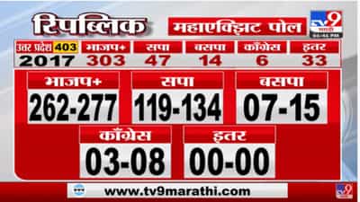 टीव्ही 9 भारतवर्ष आणि पोलस्ट्रॅटनं उत्तरप्रदेशात 211-225 जागा भाजपला तर, समाजवादी पक्षाला 146 ते 160 जागा मिळतील. तर बसपाला 14-24 तर काँग्रेसला 4-6 जागा मिळतील असा अंदाज वर्तवला आहे.