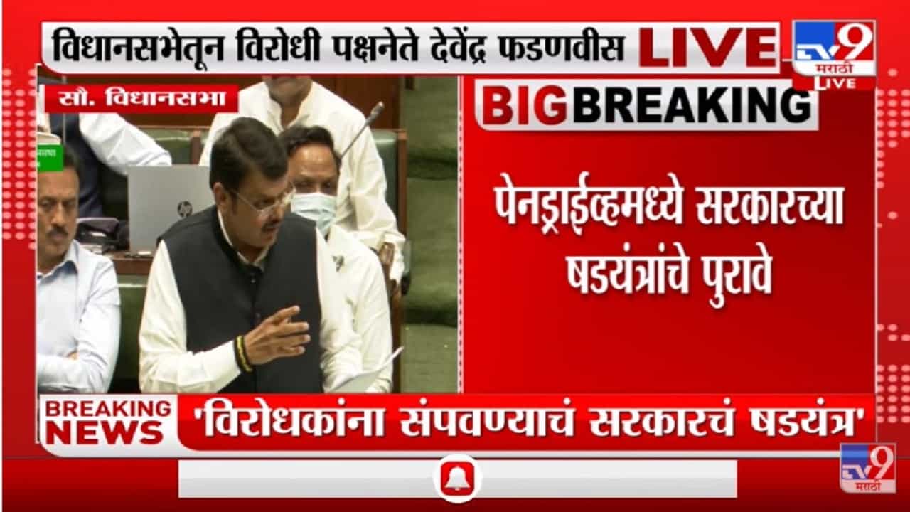 मुंबई : विरोधी पक्षनेते देवेंद्र फडणवीस (Devendra Fadnavis) यांनी आज विधानसभेत आरोपांची (Assembly Session) सरबत्ती केली आहे. महाविकास आघाडीचे (Mahavikas Aghadi) अनेक नेते एका सरकारी वकिलाच्या माध्यमातून भाजपाच्या अनेक नेत्यांचा सूड उगविण्याचे कसे षडयंत्र रचत आहेत, साक्षीदारापासून ते पुराव्यांपर्यंत सारे कसे मॅनेज केले जाते आहे, याचा संपूर्ण लेखाजोखाच माजी मुख्यमंत्री आणि विधानसभेतील विरोधी पक्षनेते देवेंद्र फडणवीस यांनी आज विधानसभेत एका स्टिंग ऑपरेशनच्या माध्यमातून सादर केला. हा महाविकास आघाडीचा महाकत्तलखाना असल्याचे आणि सरकारी वकील अॅड. प्रवीण चव्हाण यांच्यामार्फत अनेक महानायक हा खेळ खेळत असल्याचा अतिशय गंभीर, स्फोटक आरोप पुराव्यांसह केला. सुमारे 125 तासांच्या या स्टिंगमधील महत्त्वाचा भाग 29 वेगवेगळ्या पेनड्राईव्हच्या माध्यमांतून त्यांनी सादर केला. भाजपमधील काही नेते टार्गेटवर असल्याचा आरोप यावेळी फडणवीसांकडून करण्यात आलाय.
