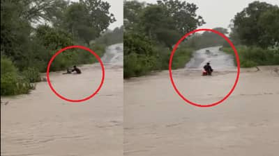 VIDEO : स्टंटबाजी आली अंगलट… पुराच्या पाण्यात त्यानं चालवली बाईक, पाण्याचा वेग अचानक वाढला अन्…