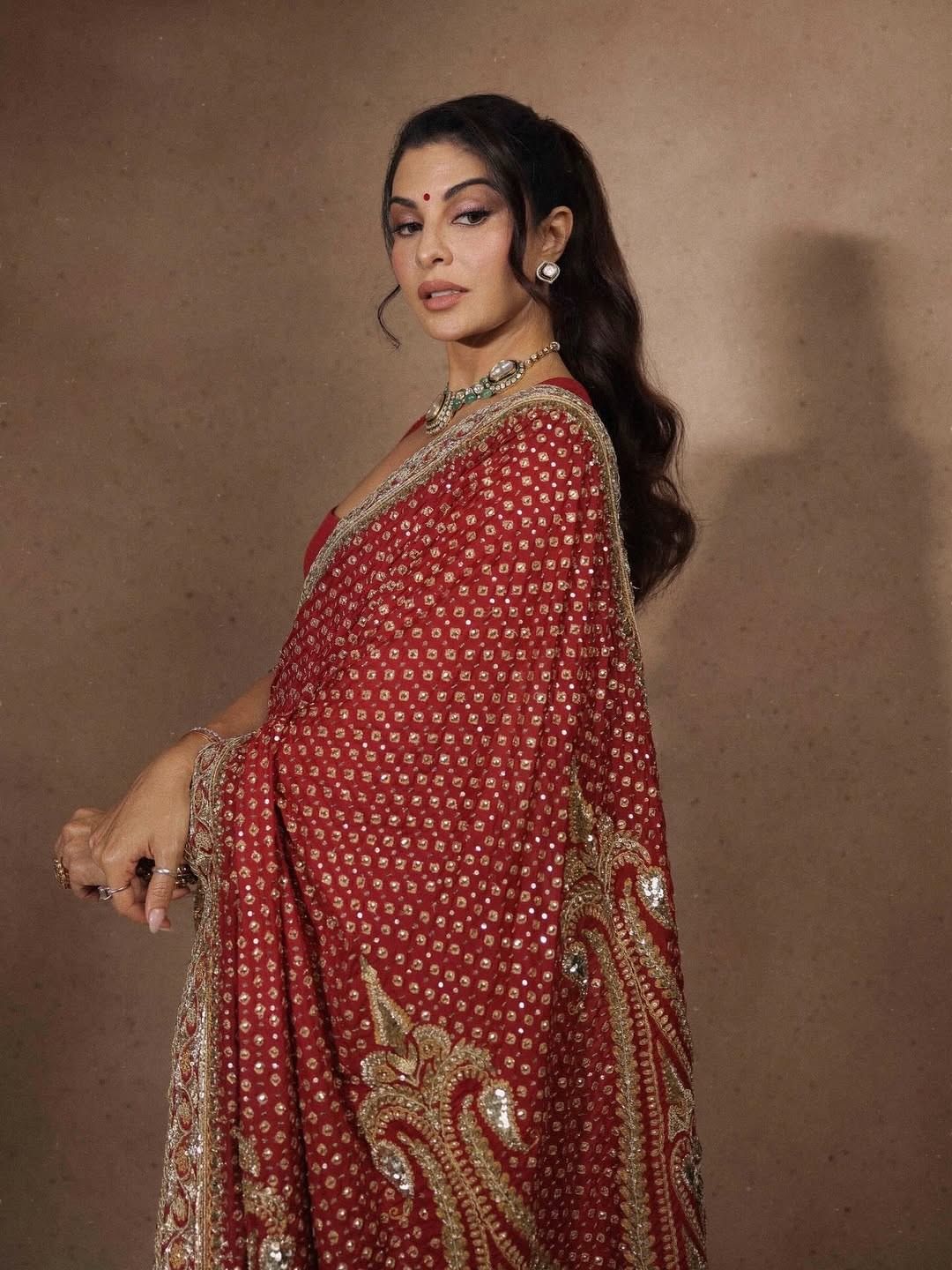 लाल रंगाच्या साडीत जॅकलिन हिचं सौंदर्य फुलून दिसत आहे.