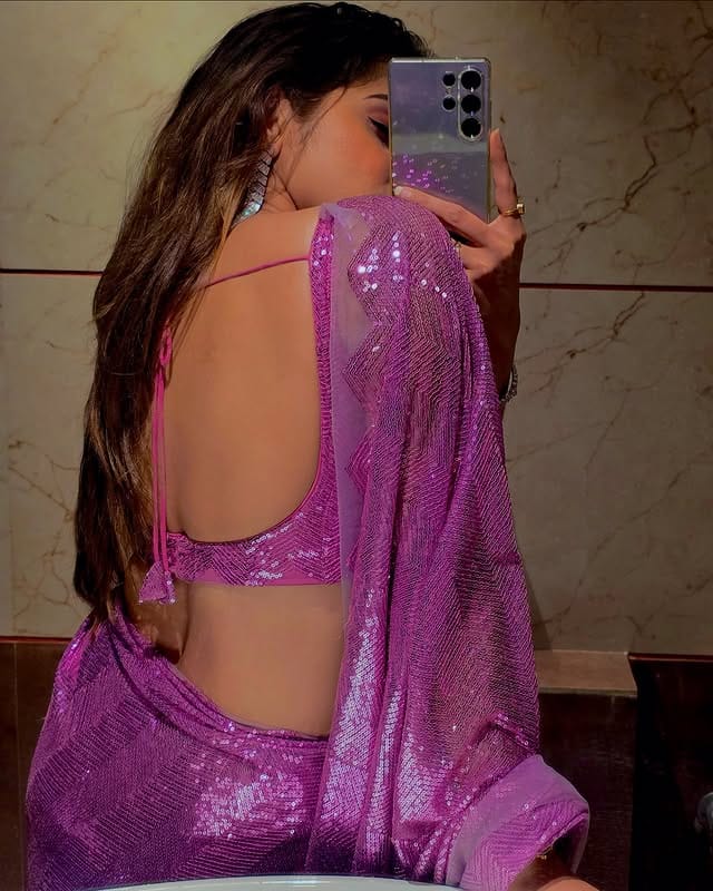 ज्यामध्ये तिने जांभळ्या रंगाची चमकदार साडी परिधान केली आहे.