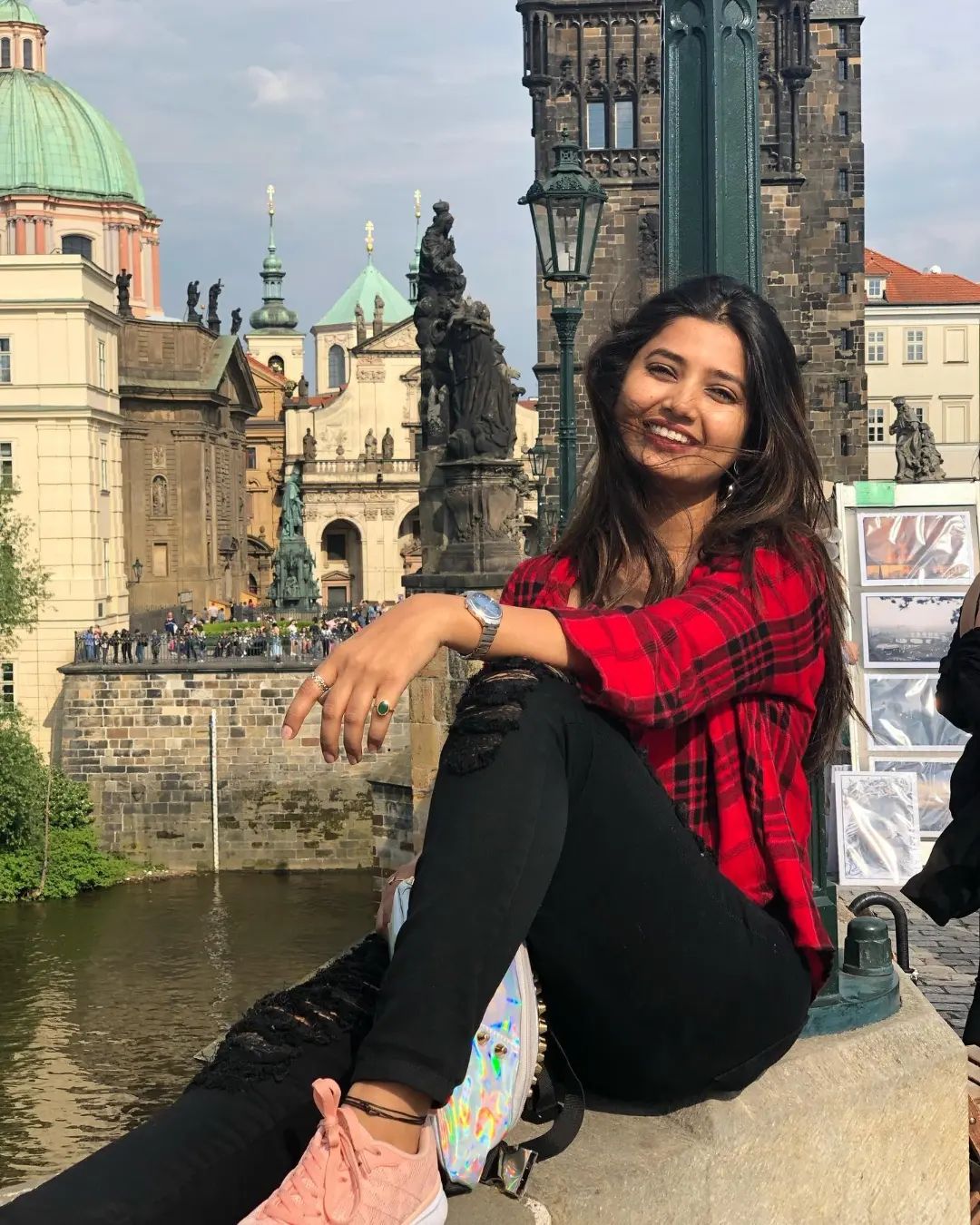 लाल रंगाचा शर्ट आणि काळ्या जीन्समध्ये हॉट लुक