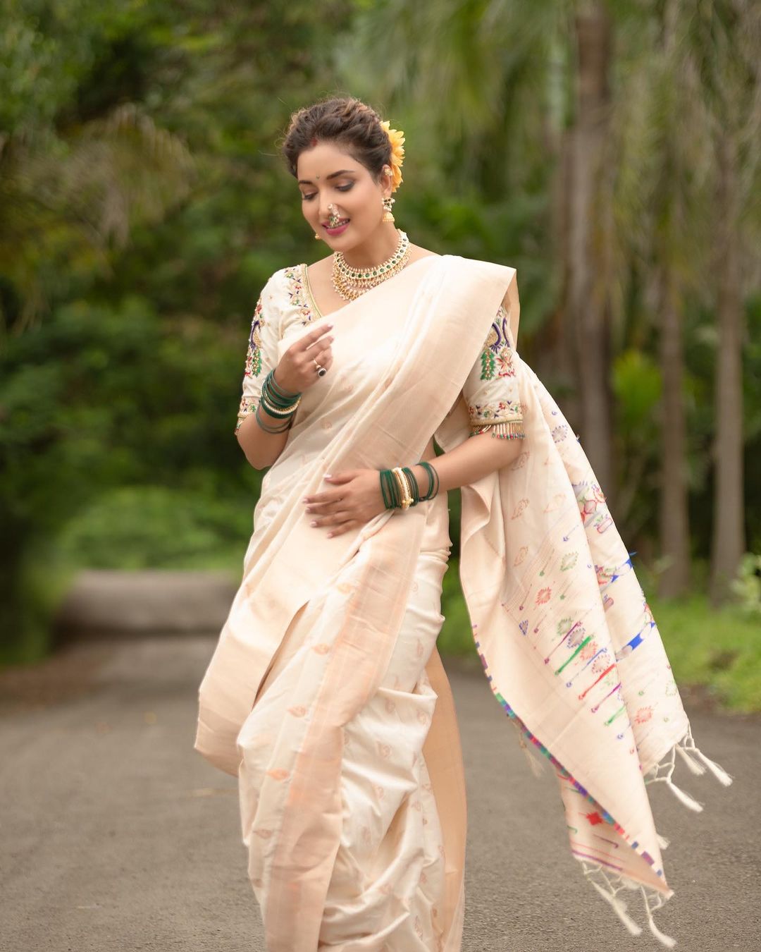 पांढऱ्या रंगाच्या नऊवारी साडीमध्ये रुपालीचं सौंदर्य फुललं