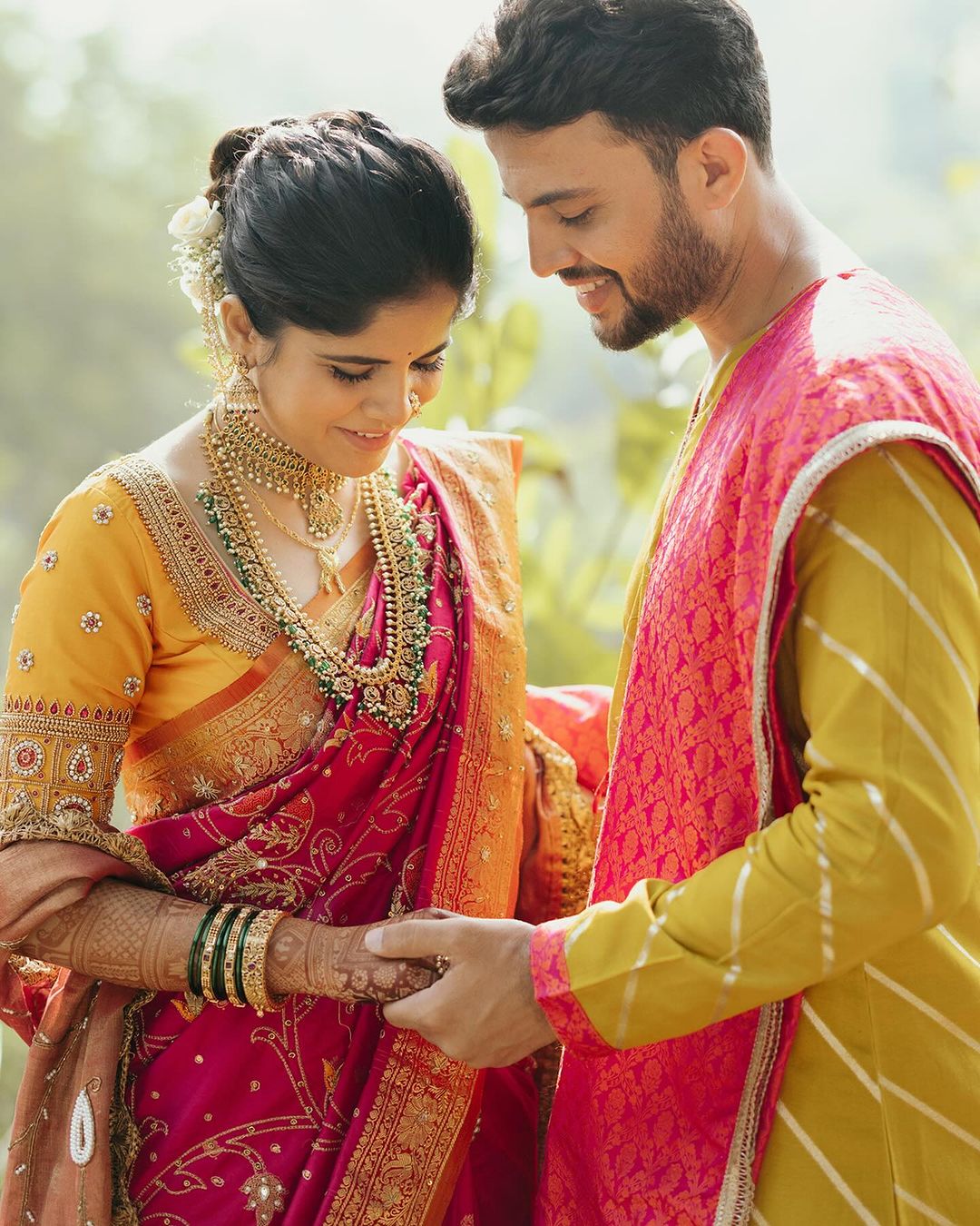 विधीसाठी अमृता-प्रसादचा गुलाबी-पिवळ्या रंगसंगतीचा पोशाख